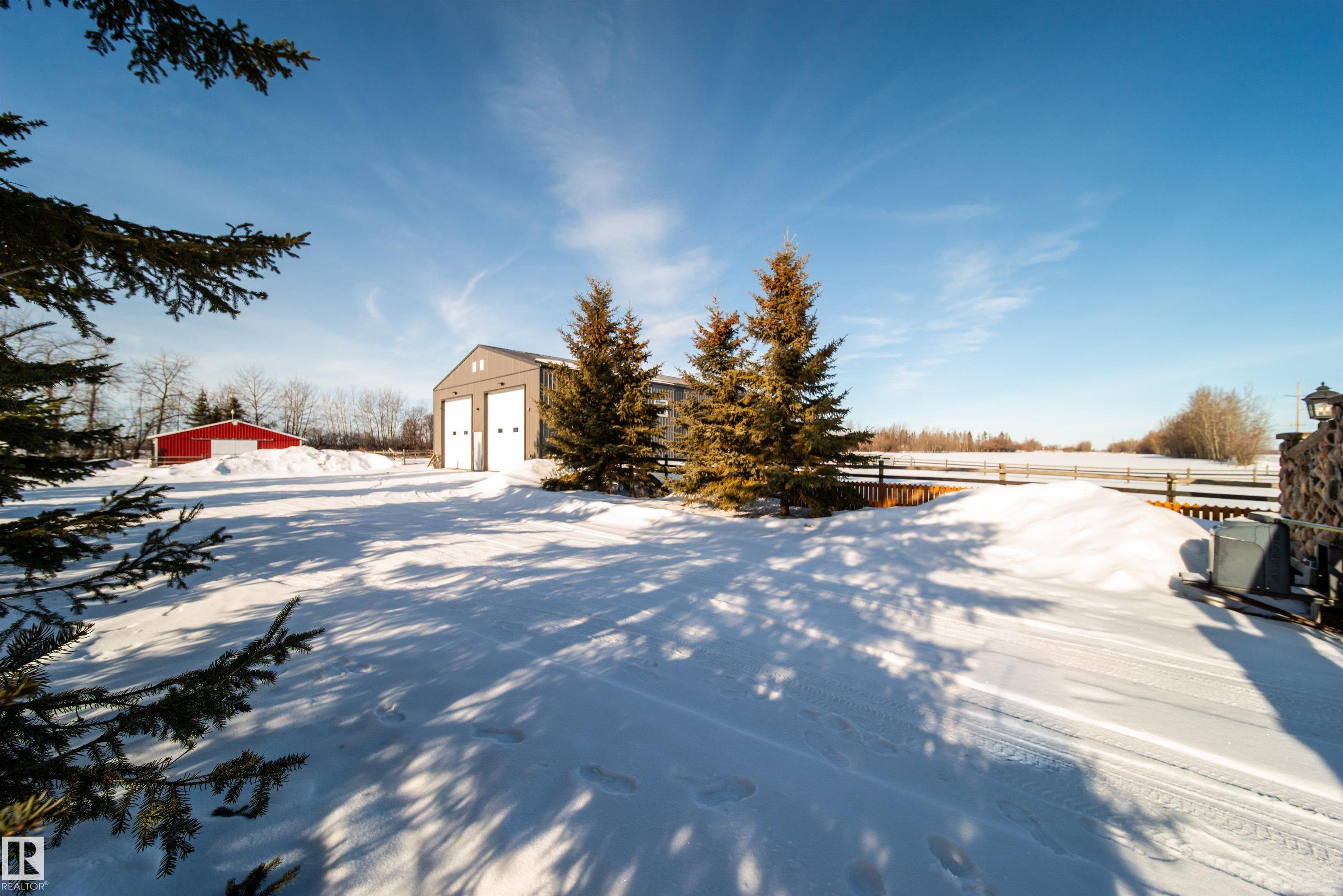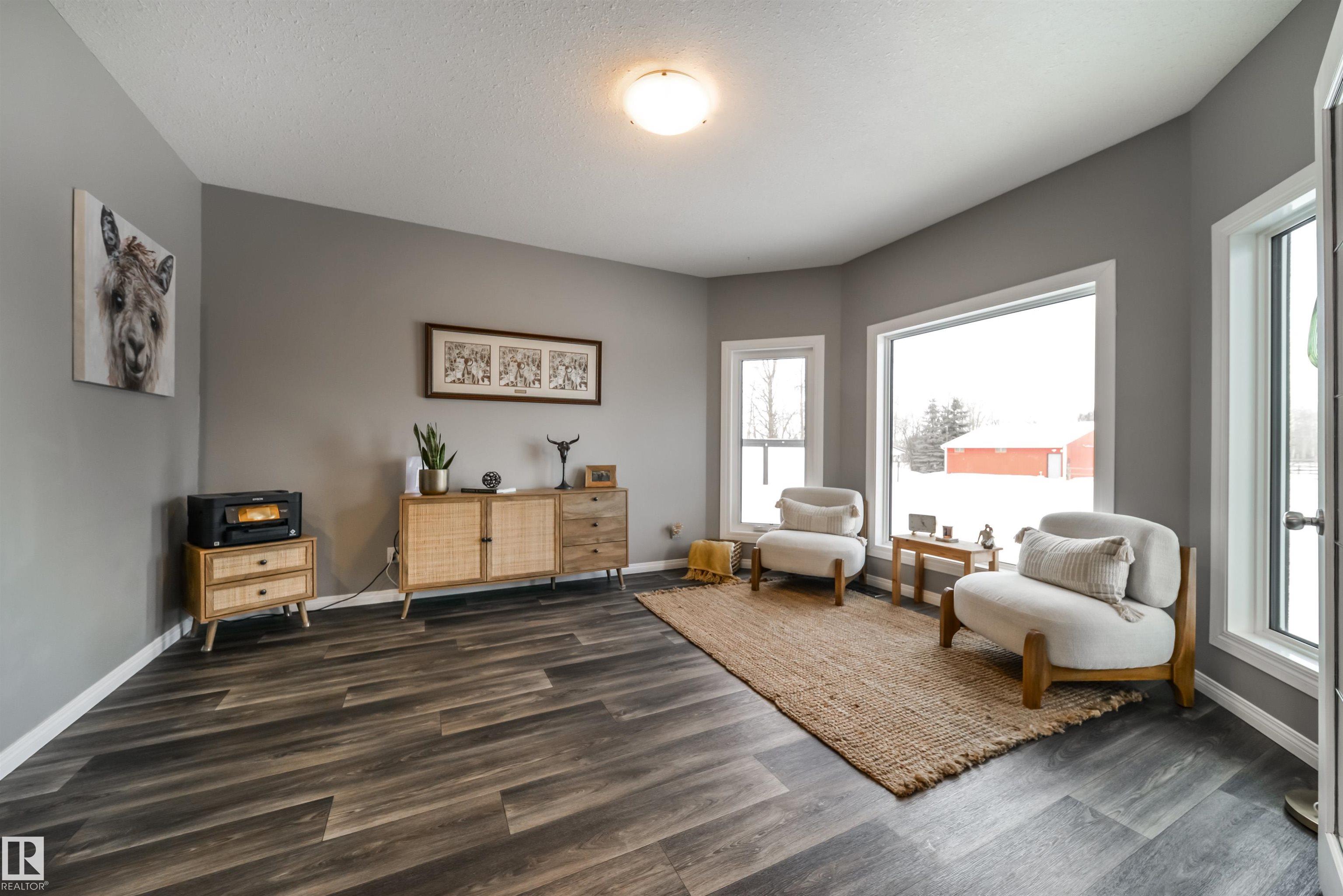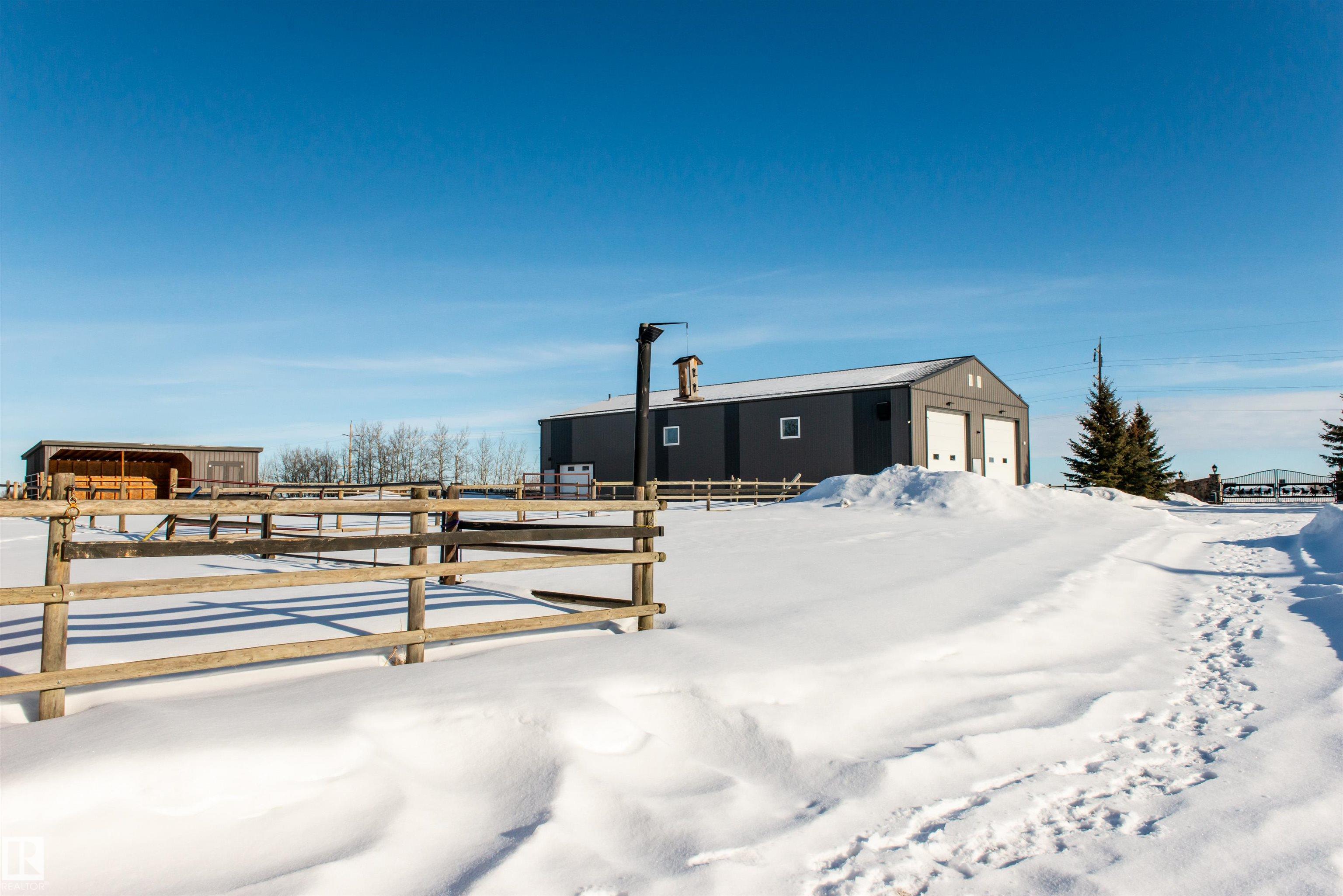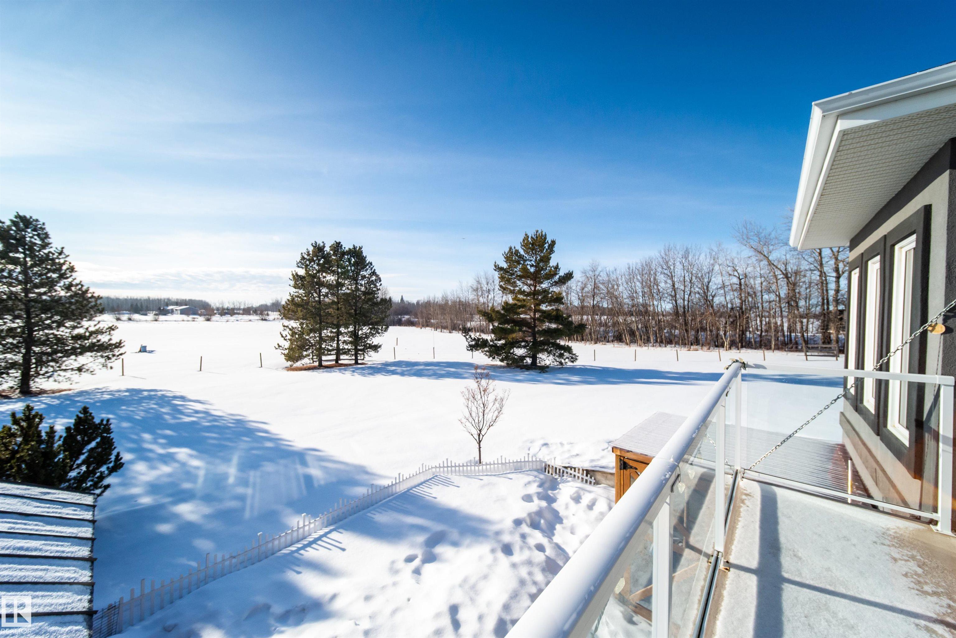 Bring the family and the horses! This beautifully updated 3 bedroom, 3 bath walkout bungalow sits on 12.92 acres just 20 minutes from St. Albert and blends modern comfort with acreage living. The bright open-concept main floor features beautiful kitchen with quartz island, stainless appliances, walk-in pantry, and south-facing views from the dining area with access to a covered deck. The living room offers 11’ ceilings, large windows, and a cozy gas fireplace. A spacious den, laundry/boot room, full bath, a...